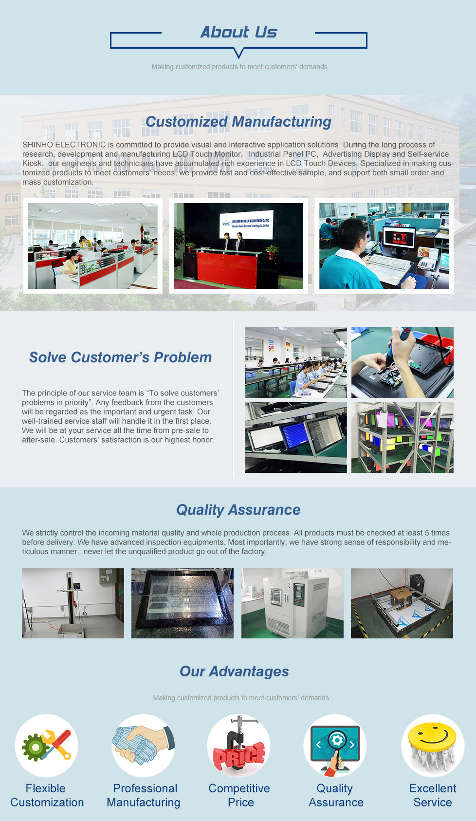 Shenzhen Shinho Electronic Technology Co., Ltd is a leading provider of visual and interactive application solutions. Our main products include lcd touchscreen monitor , open frame lcd monitor , waterproof high brightness monitor , industrial panel PC , embedded touch panel PC, full IP65 panel PC , industrial tablet PC, self service KIOSK, advertising display etc. We provide our products and services on a worldwide basis, our products are widely used in Automation, SCADA , KIOSK , ATM, POS , Transportation, Medical, Gaming , Oil Gas & Energy , Military etc.